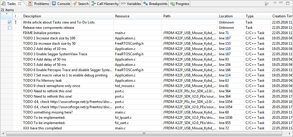 test_factorial()These comments help track necessary actions across a project. While most IDEs display TODOs in a separate panel, my TODOs are scattered across multiple files, including markdown files that don’t require an editor. For instance, here’s a basic TODO panel from Eclipse. It’s nice, but Eclipse is a memory hog. I don’t want to open it just to see my list.